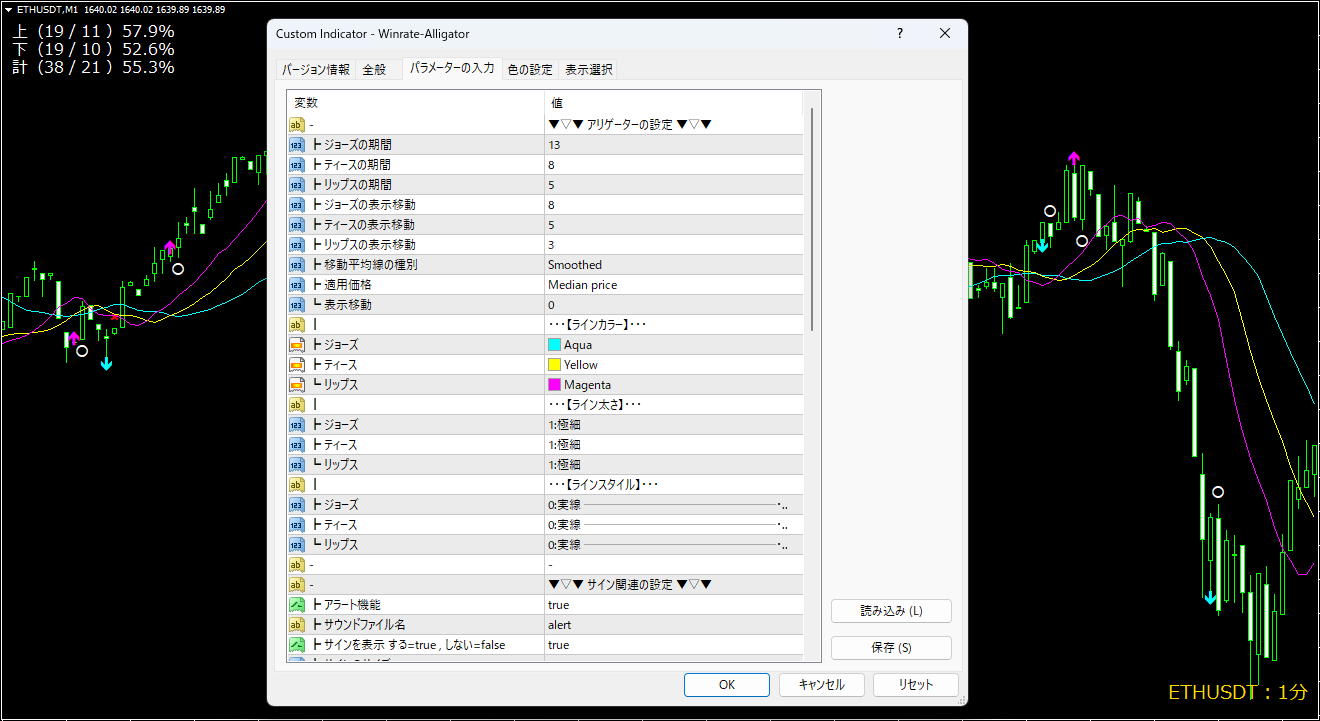 アリゲーターは移動平均線のようなラインインジケーターですが、今回はそのアリゲーターのサインツールに勝率表示機能を付けたものを作りました。