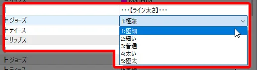 ジョーズ、ティース、リップスの太さを個別に設定することができます。