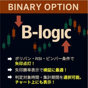 「B_logic」は、以下の3つのテクニカル条件を組み合わせて、反転の兆しを矢印で表示:- ボリンジャーバンド(±σラインで反転検出)