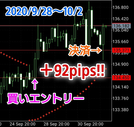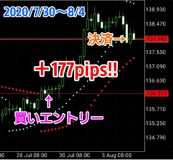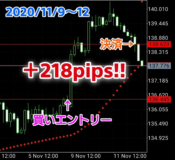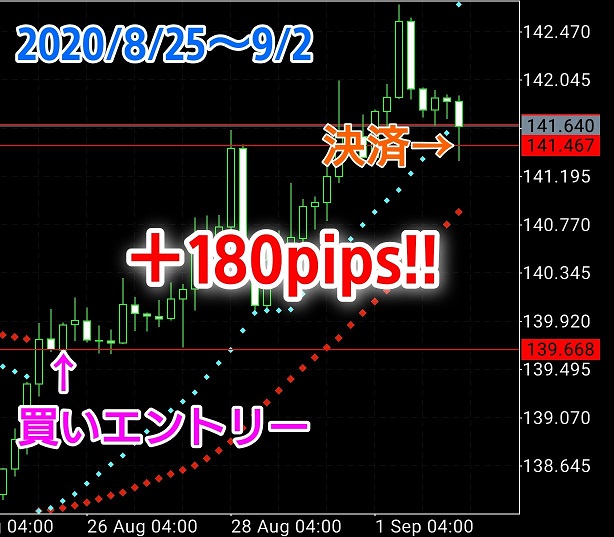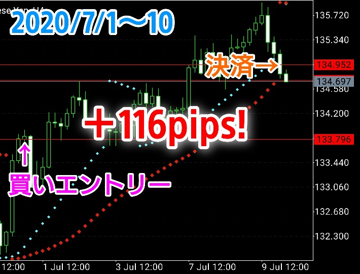 丸いドットに沿ってトレンドを継続させ、ドットの転換と共に決済。
